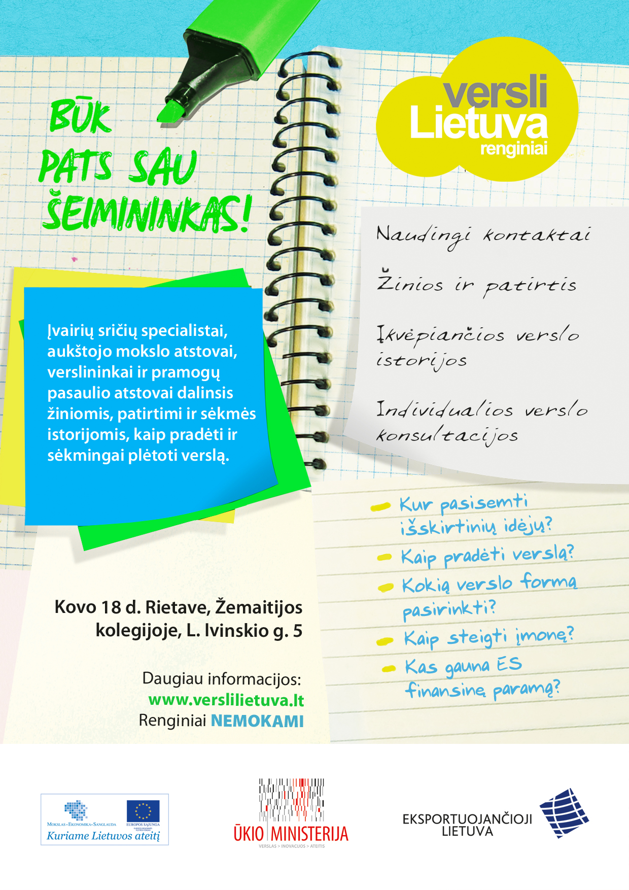 Maloniai kviečiame dalyvauti verslumą skatinančiuose „Versli Lietuva“ renginiuose. Rietave laukiame kovo 18 d. Žemaitijos kolegijoje, adresu L. Ivinskio g. 5.