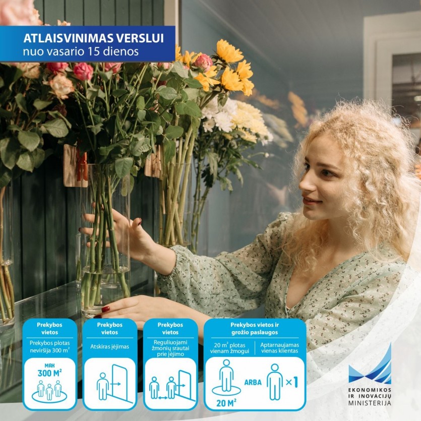 Nuo pirmadienio bus leidžiama ir prekyba gėlėmis tiek uždaroje patalpoje, tiek lauke. Prekiauti gėlėmis bus galima visose prekybos vietose – ir turguje, ir prekybos centruose esančiose parduotuvėse. Gėlių pardavėjai prekybos vietose privalės laikytis ne mažesnio kaip 15 m2 prekybos ploto arba aptarnauti tik vieną klientą vienu metu.