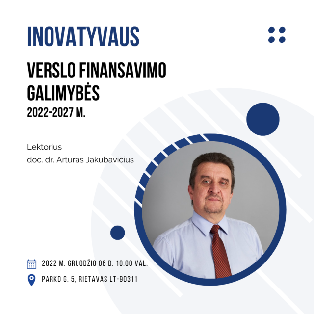 Seminarą ves – doc. dr. Artūras Jakubavičius, VšĮ „Lietuvos inovacijų centro“ Inovacijų paramos paslaugų departamento vadovas, inovacijų vadybos ekspertas, socialinių mokslų daktaras, Vilniaus Gedimino technikos universiteto profesorius partneris. Turi 25 metų patirtį mokslinių tyrimų srityje, daugiau kaip 25 metų patirtį inovacijų konsultavimo paslaugų teikimo, vadybos metodų diegimo ir inovacinių procesų tobulinimo, inovacinių projektų plėtojimo, inovacijų finansavimo pritraukimo, technologijų perdavimo srityse.