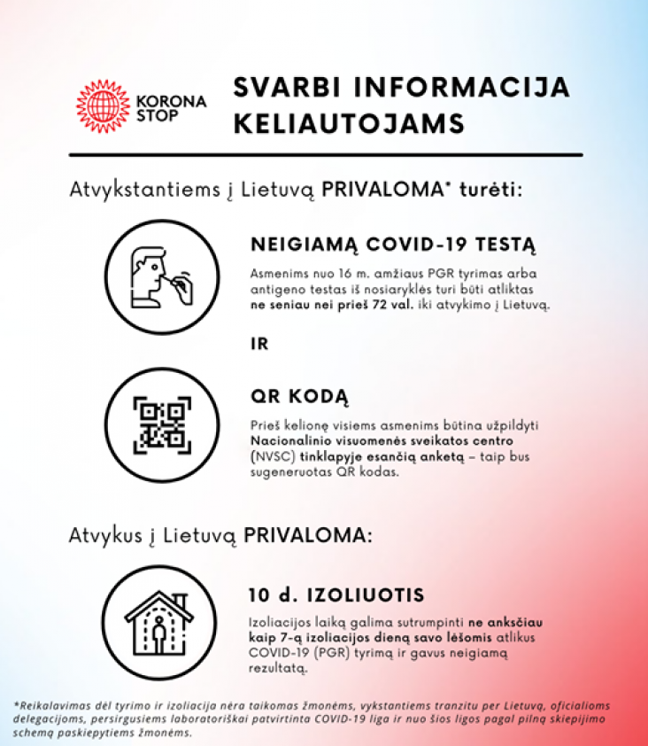 Lietuvos Respublikos sveikatos apsaugos ministerija informuoja, kad atvykstantiesiems į Lietuvą privaloma turėti ne tik neigiamą COVID-19 testą*, bet ir QR kodą, kuris gaunamas dar prieš kelionę užpildžius Nacionalinis visuomenės sveikatos centras (NVSC) tinklapyje esančią anketą.