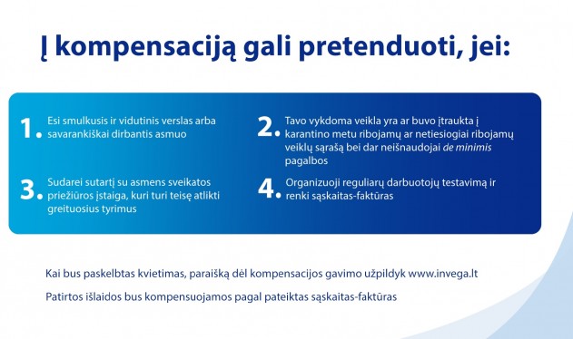Jei jūsų įmonė priskiriama smulkiajam ir vidutiniam verslui arba verčiatės individualia veikla, o jūsų veikla karantino metu buvo apribota, jūs galite gauti kompensaciją darbuotojų testavimui pagal priemonę „COVID-19 tyrimų kompensavimas smulkiojo ir vidutinio verslo subjektams“.