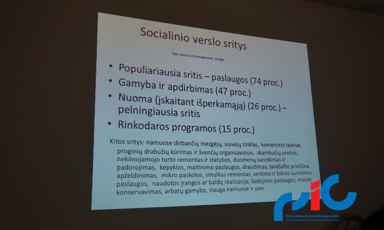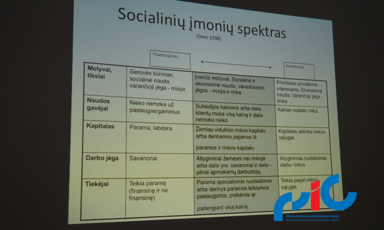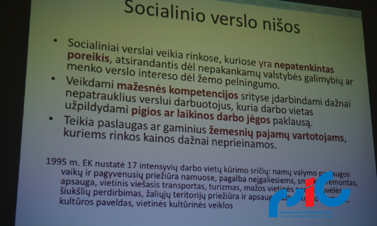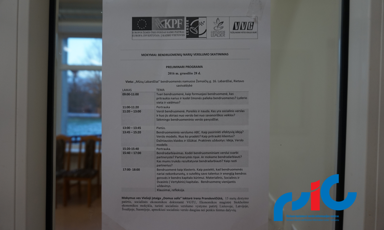 Pagal „Telšių ir Rietavo savivaldybių vietos plėtros 2014-2020 m. strategiją“ Telšių vietos veiklos grupė surengė mokymus „Bendruomenių narių verslumo skatinimas“ Labardžiuose 2016-12-28. Rietavo turizmo ir verslo informacijos centro turizmo specialistė Judita Pakalniškytė ir projektų komunikatorė Vida Zubielė dalyvavo minėtuose mokymuose ir aptarė klausimus apie socialinį verslą, kaip formuojasi bendruomenė, kas pritraukia narius ir kodėl žmonės palieka bendruomenes. Sėkmingo bendruomeninio verslo pavyzdžius. Visą programą galite parsisiųsti čia.